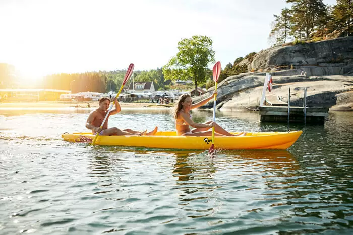 Med SUP, kajak eller kanot kan du komma riktigt nära klippornas alla små gömställen i viken och utforska skärgården på egen hand. Kanske har du turen att få se en makrill snabbt simma förbi, eller en knubbsäl sticka upp huvudet ovanför vattenytan just när du passerar? Eller så stannar du i vattnet kring Lagunen och hör måsarnas skri på avstånd eller fångar dina egna, salta musslor längs med klippväggen intill bryggan.